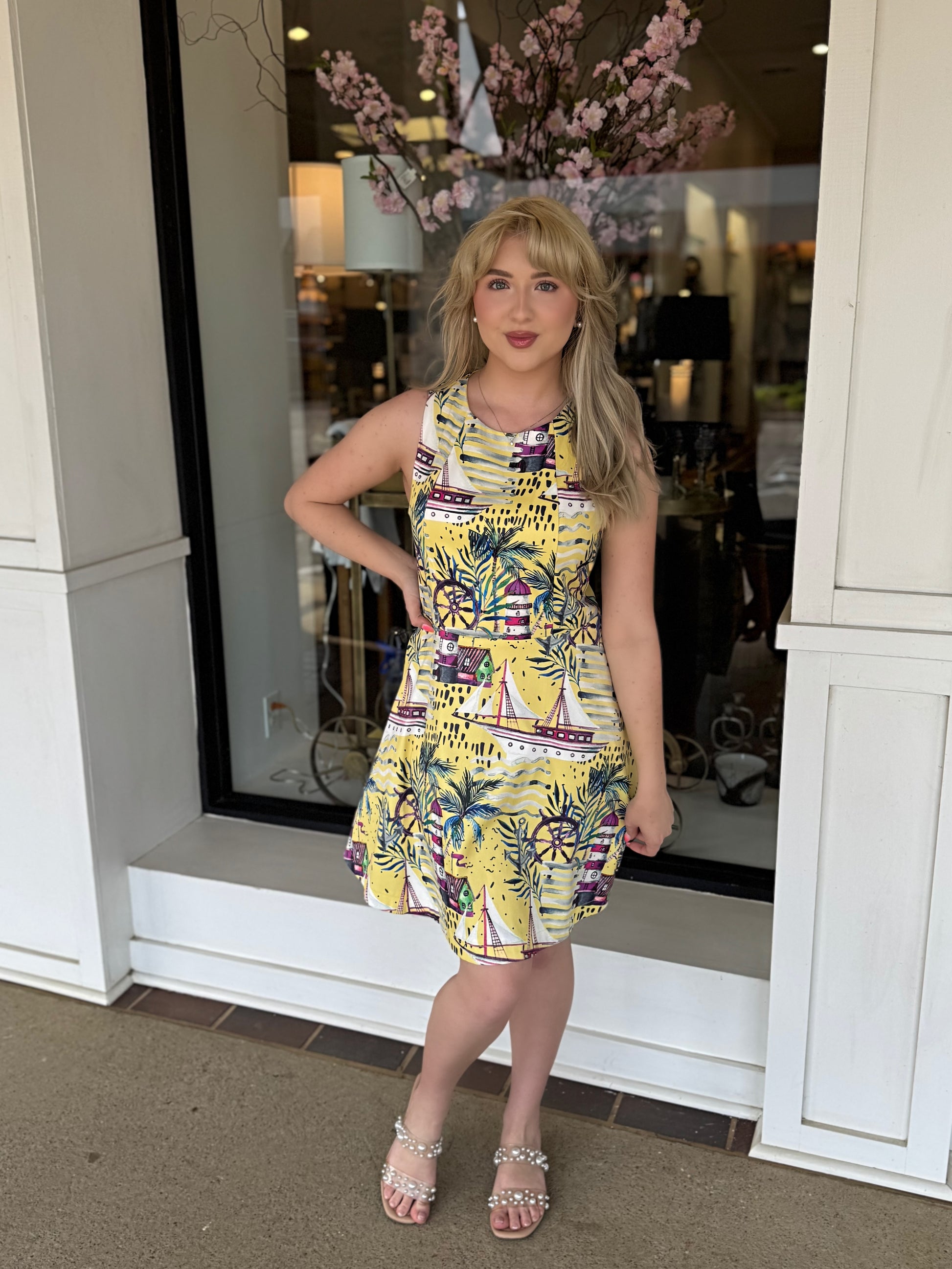 This yellow dress features a charming seaside print and an A-line flare silhouette that flatters every figure. Designed for comfort and style, it’s an ideal choice for your next getaway, combining effortless elegance with a breezy, relaxed fit. Perfect for beach strolls or casual outings, it brings a touch of coastal charm to your wardrobe.