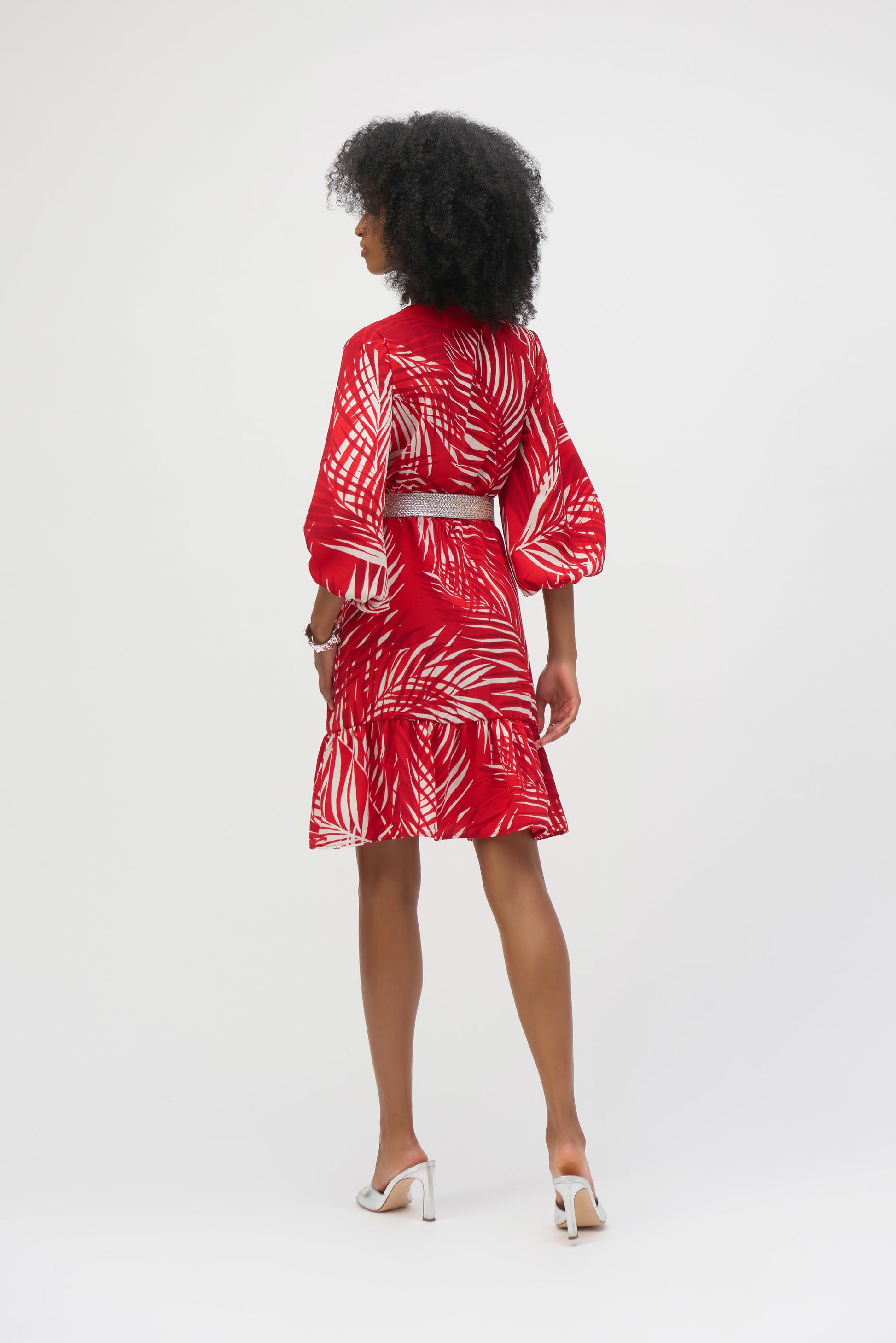Add finesse to your style with this tropical print gauze dress. The wrapped neckline and ruffled skirt accentuate the garment’s charming flounced silhouette. The waistline showcases a delicate novelty belt featuring a silver foiled jute and metallic faux leather buckle for extra flair.